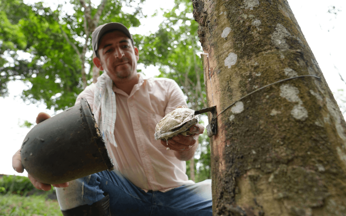 Der Schuhhersteller Cueros Vélez als gutes Beispiel für die Verantwortung der Privatwirtschaft: Eine Fotogalerie zeigt, wie die Rinde des Kautschukbaums zu einem zuverlässigen und dennoch abholzungsfreien Begleiter auf unseren Straßen wird.